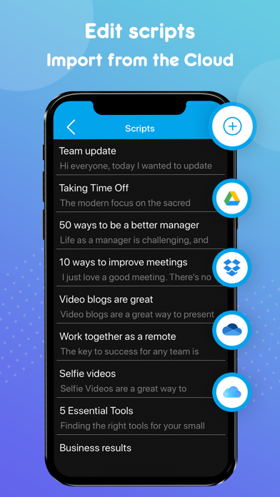 This app is perfect for business videos and video resumes. Plan your speech and then communicate it confidently, whilst maintaining good eye contact with your audience. Here's how it works... You read a pre-prepared script while filming yourself using the front-facing camera. Simply press record and read the script as it scrolls down the screen. As the script scrolls next to the camera lens, so you look like you're talking to your audience when you are actually reading! This app will massively reduce your time to record videos, and make your presentation more confident and engaging. Here are some of the features: * Record videos in 4K and high definition using the front and rear-facing camera on supported devices. * Record your video in landscape or portrait. * Tap the script to manage and share teleprompter scripts across different iOS devices. * Import your scripts from Dropbox, Google Drive, OneDrive or iCloud in .doc, .docx, .txt, .rtf, .pdf formats. * Format your scripts in Rich Text to make them easier to read. * Set a countdown to get into position, for pre-roll and to automatically end recording. * Automatically add subtitles to your videos. * Add a virtual background using the Green Screen (chroma key) filter * Resize your video to landscape, portrait or square after recording. * Control the app with a Bluetooth device. This includes starting and stopping recording and controlling the script scrolling. * Tap the screen to manually set the exposure, tap and hold for AE Lock, pinch the screen to zoom. * Mirror the script for use in a teleprompter device. * Display a 3x3 grid to help you position yourself. * Adjust the font size and scrolling speed. * Use your MDM software to configure the privacy settings for your staff