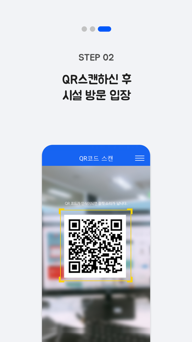 - 발급 : Case 1 : 관리자로 부터 인증받은 GPS좌표값이 탑재된 QR코드를 특정한 장소에 부착 또는 시설관리자 스마트폰 화면에 GPS QR 표출(SMS방식도 가능) Case 2 : 관리자로부터 스마트폰으로 전송된 1회용 SMS QR을 시설사용위치에서 발급 - 인증 : CASE1 : 특정장소에 부착된 QR 또는 시설관리자 스마트폰에 부착된 QR코드를 시설사용자의 스마트폰 리더기로 인증방식 CASE2 : 특정장소에 부착된 리더기 또는 시설관리자 스마트폰 리더기에 시설사용자가 부여받은 1회용 SMS QR을 통해 시설 관리자가 인증방식 - 간편로그인 지문또는 간편비밀번호로 로그인 편의성 확보. 시설사용자,무인출입관리, QR출입관리, 문진표, QR근태관리등 입출입기록과 스케쥴관리등 회원가입필요없이 전자출입명부 및 근태관리를 무인출입을 빠르고 쉽게 활용할수 있으며, 여러사업장의 출입체크현황을 스마트하게 관리합니다.