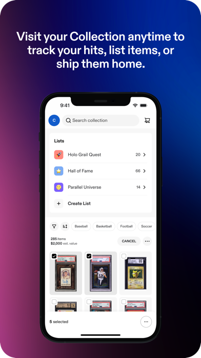 Fanatics Collect is the most trusted and dynamic marketplace for buying and selling sports cards, TCG, and sports memorabilia. EXPLORE Browse hundreds of thousands of authenticated sports cards, TCG, and memorabilia listings in our Buy Now marketplace or Weekly and Premier auctions. BUY Buy with confidence. Every card for sale on Fanatics Collect has been shipped to us, authenticated and verified before listing. SELL List your cards for sale and find a buyer quickly and easily, with the most competitive seller rates in the industry. VAULT Store and secure your collectibles in our industry-leading Vault facility. App Features More Ways to Sell Users can easily sell their cards through our curated Weekly Auctions, our high-end Premier Auctions, or as a fixed price with the ability to accept offers on our Fixed Price Marketplace. Your Vault Portfolio View your entire portfolio on your phone. All cards are listed in a fun and straightforward interface, including insured values for each card and a stated value of your entire vault portfolio. Ship to the Vault Not a Fanatics Collect Vault member yet? The app provides users with a unique vault address with instructions on how to send in your first shipment of cards.