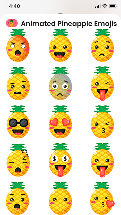 Animated Pineapple Emojis:- How to use stickers: -Tap a sticker to add it to your message thread -Drag a sticker into the message thread to place it on another sticker, a photo, or just anywhere you want. -Scale and rotate stickers by using a second finger before you place them.