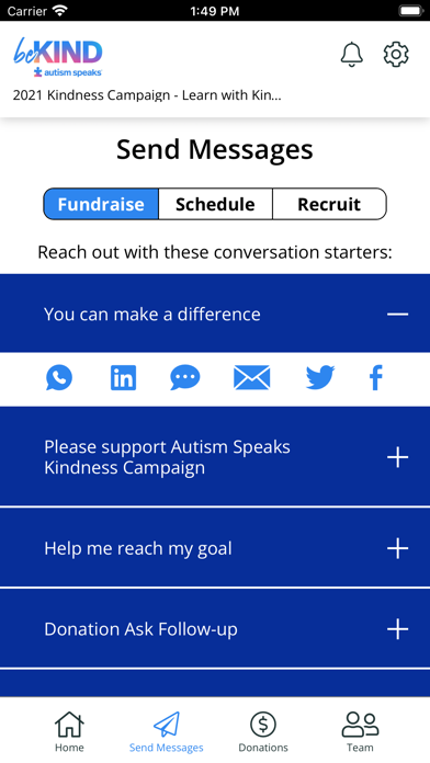 Track your daily kindness activities and fundraise on the go with your Autism Speaks Kindness application. See kindness activities, update your page, send emails, and check your progress – all from the palm of your hand. Autism Speaks Kindness application is a great tool to track your fundraising progress, and to keep current on all Autism Speaks Kindness news! Please note: The Autism Speaks Kindness iPhone application is only available to current registrants of the Autism Speaks Kindness App event. If you haven't registered yet for this year's event, please go to https://www.autismspeaks.org/kindness to register for an event near you.