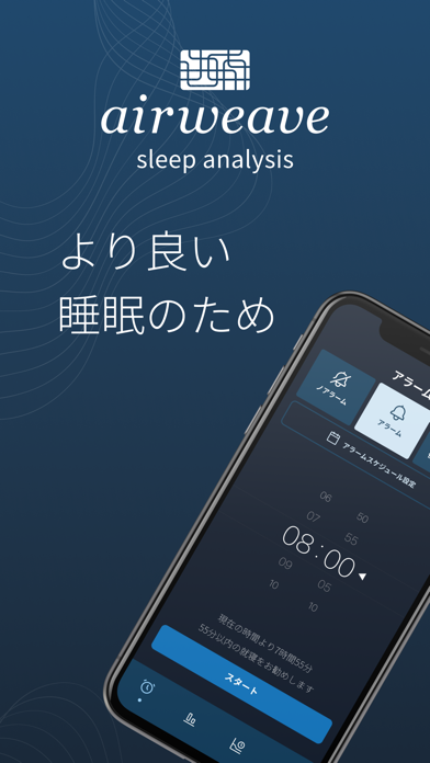一流アスリートも使用する無料の睡眠アプリ。明日のパフォーマンスを最大化する為に…「睡眠の質」を見える化。日々の睡眠を計測・記録し、管理・比較することで、睡眠の質の向上をサポートします。ヘルスケアへの活用にも。 【特徴】 エアウィーヴが長年続けてきた、一流アスリートやIMGアカデミーの学生と、エアウィーヴご使用者を対象にした睡眠研究で蓄積した「データ」と、個別身体情報を計測して分析・製品化する「技術」をアプリ開発に活用しています。 【機能】 ・目覚ましアラーム ・眠りの浅い時にスッキリ目覚められる、快適アラーム ・日々のアラーム設定作業を省く、アラームスケジュール ・就寝を促すPush通知 ・睡眠の質向上の為の、各種指標グラフ(睡眠効率、睡眠時間、就床時間、起床時間、睡眠サイクル、中途覚醒回数、深い睡眠時間、深い睡眠の割合) ・過去の睡眠との比較・分析を可能にするヒストリー 【使い方】 使い方は簡単!スマートフォンを枕元に置いて眠るだけ。 0.睡眠アプリをダウンロード(無料) 1.アプリを起動 2.会員登録(無料)(※1) 3.アラーム時刻を設定 4.Startボタンをタップ 6.アラーム時刻設定時の90分前に実施したことをチェック 7.枕元に置いて就寝(※2):睡眠計測を開始 8.アラームが鳴り、停止し、「日別の睡眠画面」で結果を確認 9.日々のデータを蓄積し、「ヒストリー画面」で比較することで、最適なライフサイクルを発見。ヘルスケアにも活用頂けます。 ※1会員登録(無料)していただくことで、「データのバックアップ」も可能に。 ※2 他の睡眠アプリと同様に、使用中はバッテリーを消費します。使用の際には電源ケーブルに接続し、充電しながらご利用ください。 【推奨環境】 ・iOS 13.0以降 ・iPhone 7以降 ※iPad、iPod touchは非対応 【こんな方にオススメ】 ・快眠したい方 ・効果的な睡眠を取りたい方 ・明日のパフォーマンスを最大化したい方 ・寝ているはずなのに、日中に眠くなってしまう方 ・睡眠の質が気になっている方 ・ご自身の睡眠を分析したい方 ・睡眠データをヘルスケアに活用したい方 *対象年齢12歳以上