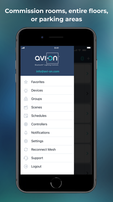 The Avi-on Pro Mobile Commissioning App is exclusively for use with Avi-on Pro Commercial Lighting Controls. The Mobile Commissioning App is part of the Avi-on Digital Toolbox, which enables installers to commission projects of any size and complexity. The user experience of the Mobile Commissioning App is optimized for small- to medium-sized networks. For large-scale projects where thousands of nodes are being commissioned and tuned, Avi-on recommends the Avi-on Pro Large Scale Commissioning App, available to authorized installers at Avi-on.com. Avi-on Pro is a secure, large-scale commercial lighting control solution for office, school, healthcare, warehouse, manufacturing, parking garage, horticultural, and other industrial applications. Using new/current smartphones or tablets with current operating systems, commercial installers can quickly set-up devices, program schedules, and add sensors, scene controllers, or wireless switches. Avi-on is “gateway free,” and no wifi hub or gateway is required. All schedules and settings are saved on a BluetoothⓇ chip inside each device. Once programmed locally, the schedules will operate without the Internet or your phone nearby. Avi-on enables many users to control many devices through a single account. Your account and settings are saved in the Avi-on cloud, providing instant back-up. If you want remote operations and commissioning, energy monitoring, or demand response, install an optional Avi-on Remote Access Bridge (RAB). The RAB turns Avi-on into a DLC 5.0, OpenADR, and Title 24 certified networked energy monitoring solution that meets the toughest building codes and maximizes utility rebates where available. How do you get started? · Power any Avi-on Pro (commercial) compatible device by wiring it or plugging it in (adaptor, plugin, switch, sensor, LED driver, wall station, etc · Use a current smartphone or tablet with current OS with Bluetooth and with strong wi-fi access · Download the latest version of the Avi-on Commissioning App. Register your account and password. Check spam folder for verification and password emails · Stand near the powered device(s). Press the big + button to add your first device. FAQs are here. See https://avi-on.com/resources/ What are the products available for your Avi-on network? · Avi-on Direct Connect Load Controllers, Avi-on Wired Sensor, PIR Sensor, and Microwave Sensor for occupancy/vacancy and daylight harvesting · Avi-on Battery and AC wall stations · Avi-on Movable Switch: 3-way wireless switching · Avi-on Remote Access Bridge (RAB): energy monitoring, 24/7 network synchronization, Wi-fi remote control, and Alexa compatibility