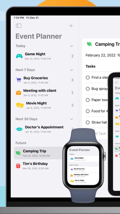 Event planner boasts a clean and gorgeous looking user interface for event planning. It's functional, intuitive and syncs across all your devices like iPhone, Mac, Apple Watch and iPad. This is the only app you will ever need to plan your trips, shop groceries, plan movie nights, remember doctor's appointment, birthdays and everything else. Features at a glance 1. Works and syncs across your iPhone, Mac, iPad and Apple Watch. 2. Menubar support on Mac. 3. Recurring/Repeating events to track regular appointments, birthdays, anniversaries, medication, college schedule and more. 3. Timezone support to track events in different time zones 4. Bullet point tasks to remember things about an event 5. Add website and meeting links to events for quick access. 6. Pin favourite/important events on top 7. Search your events across all your devices #Tags Calendar timeline to-do tasks,planner,calendar,task,reminder,timeline,to-do,todo,list,events,timezone,routine,schedule,organiser