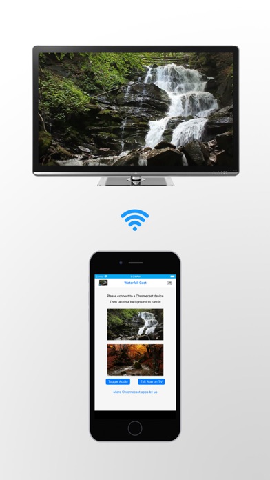 Have a lively waterfall on your TV! You can set a waterfall as the live background for your TV (that has a connected Chromecast or Google TV device). You can select the background with your iPhone or iPad. The waterfalls are *not* static images, but are alive and moving. FEATURES: • High quality live backgrounds - you can pick a lively forest waterfall or a gentle autumn stream. • These are not streamed from the internet and so, you can keep the live backgrounds running for hours without wasting your network bandwidth. • Once loaded, there are no buffering delays while watching the live backgrounds. • The live background will keep showing even after you disconnect your iPhone or iPad (Tap the 'Exit app on TV' button to quit the application on your TV). • No ads, no lags. Just fullscreen waterfalls on the TV! • The waterfalls also have realistic background audio (Tap the 'Toggle Audio' button to mute/unmute). So go ahead, have a waterfall on your TV! :-) NOTE: ** A Chromecast device or Google TV is needed to use this application. Please install it *only* if you have a Chromecast device or Google TV ** If you find any issues, please contact us before giving us a low rating - we would really appreciate it and do our best to fix them! Thanks!
