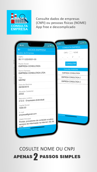 Consulte qualquer Empresa de forma rápida e simples Informações disponíveis: - Razão Social - Nome Fantasia - Tipo (Matriz ou Filial) - Data de Abertura - Situação Cadastral - Natureza Jurídica - Capital Social - Atividade Econômica Principal - Atividades Econômicas Secundárias - Telefones - Endereço O aplicativo mantém o histórico de consultas realizadas, facilitando assim nova consulta