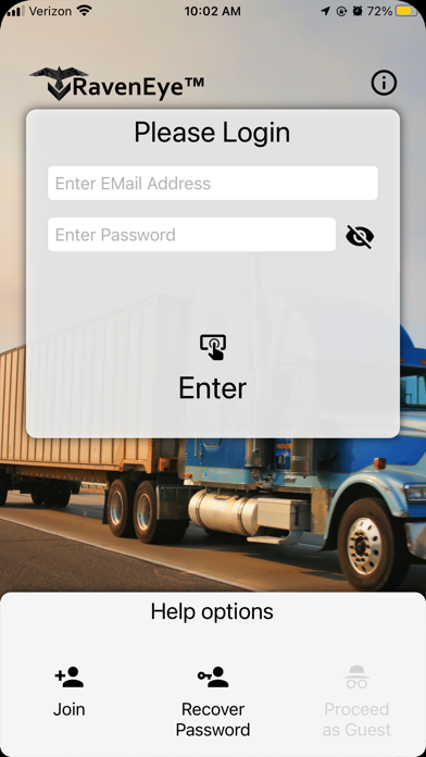 The Raven Eye Mobile App provides users within the Raven Cargo, LLC network access to the Raven Eye platform via a mobile application. DRIVER PROFILE As a driver, you can customize your preferred contact information, upload an avatar, change your password, and more. DRIVER ENROLLMENT As a driver, you can enroll as a user with Two-Factor Authentication. ACTIVE TRUCK OWNERSHIP As a driver, you can select a truck from the fleet that you are actively using to receive truck specific updates, and report issues for the specified vehicle. DRIVER ROUTES Drivers can view their current and upcoming (if available) assigned routes. FIND ORDER As a driver, you can lookup an order by the order number to find and claim an order. STOP INFORMATION Within an assigned route, the related information for each stop is available. Here you can find information such as the address of the stop, related purchase orders, site specific instructions, and more. FREIGHT SCANNING To maintain the integrity of the freight loading/unloading process, each item can be validated by scanning the barcode / QR Code to ensure that it should be loaded or unloaded at the active stop. * Data Rates Apply
