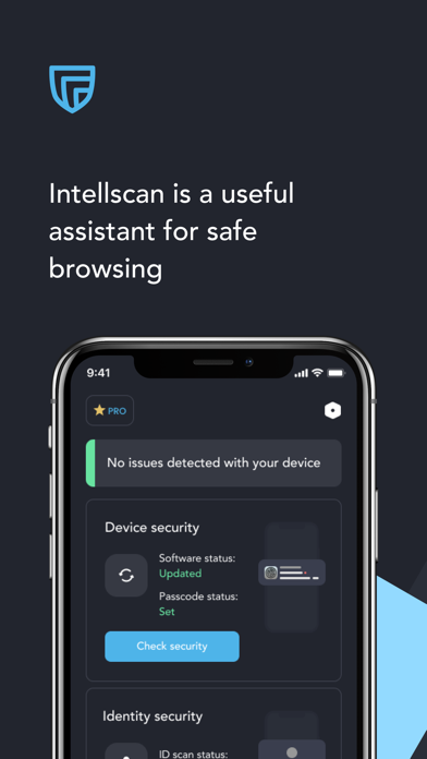 Intellscan allows you to block phishing sites, malicious sites, and other sites that may threaten your security. With Intellscan you will be safer on the Internet. Intellscan is very easy to use - just click the switch to start blocking dangerous websites and trackers. To check your calendar for unwanted ads and spam, go to Calendar Scanner and click Scan. All spam from your calendar will be deleted in an instant. We provide the ability to check an unlimited number of email addresses for data leaks. Just enter your email address and Intellscan will provide you with information about the detected leaks. You will find out what types of data leaked and on which sites it happened. You can check for updates using the operating system version check feature. With the password check feature, you can make sure that your phone is protected from unauthorized access by third parties. Subscription information. - You can cancel your subscription at any time in your Apple ID settings in iTunes and the App Store. All prices include applicable local sales taxes. - Payment will be charged to iTunes Account at confirmation of purchase. - Subscription automatically renews unless auto-renew is turned off at least 24 hours before the end of the current period. - Account will be charged for renewal within 24-hours prior to the end of the current period and will include the cost of the renewal. - Subscriptions may be managed by the user and auto-renewal may be turned off by going to the user's Account Settings after purchase. - Any unused portion of a free trial period, if offered, will be forfeited when the user purchases a subscription. https://intellscanapp.com/privacy-policy/ https://intellscanapp.com/terms-of-use/