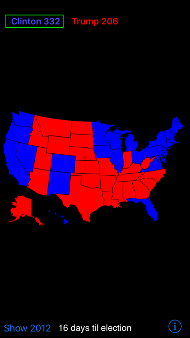 Quickly check possible 2016 election outcomes by changing states by touch from red to blue or vice versa and seeing the electoral college results. Zoom in on the map to make changes more easily. Two scenarios can be saved, or the map reverted to the 2012 results. Show friends what you hope (or fear) will happen. Examine electoral college results from 1972-2012. Did you know that Carter won Texas, but lost California in 1976? States can also be set as undecided or leaning Democratic/Republican. Instructions: Tap states to change their vote. When the map is zoomed, touch the background to toggle display of state abbreviations and electoral votes. Please note this App is meant for you to assign states how you think they might go - it does not automatically download projections (based on reviews, there seems to be a little confusion about this). The "Current Map" buttons on the flipside of the App save the current map in the given scenario - they do not load data. The "2012 Results" and "Load Map" buttons do load scenarios into the map. When new projections are released, this App will be able to download these.