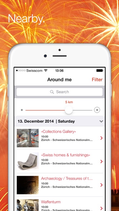 The official events calendar from MySwitzerland.com offers information on more than 15,000 events every year. The app provides details of festivals, concerts, exhibitions, sports contests, traditional customs and all kinds of attractive events focussing on anything from gastronomy to the arts. Find out quickly and easily about the kind of events that appeal to you at more than 500 locations, with details updated daily. Functions of the Swiss Events app: - Comprehensive search functions: Find events using filters or by searching in more than 20 categories. You can choose to display events at a certain location or in your vicinity; you can also search by date. - Detailed information on events: For each event, the app provides a detailed description and also photos or video content, contact details, address with directions and further links. Other similar events are also displayed for inspiration. - Current highlights, selected for you by experts on Switzerland: The pick of events over the coming days, chosen for you by our experts on Switzerland. - Top 100 events throughout Switzerland: The best 100 events of the year, gathered in a handy list. - Favourites function: Save and manage your favourites so they are at hand next time you open the app. To add an event to your list of favourites, just press the star button.