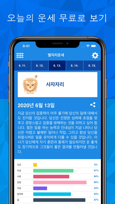 이 별자리 운세 프로그램을 통해 당신이 이용할 수 있는 서비스는 다음과 같습니다. - 현재, 미래, 과거의 별자리 운세 - 오늘의 행운의 숫자 - 행성의 형세 - 오늘의 운세 : 건강, 지성, 사랑, 감정, 직관, 창의력, 일과 재물. 오늘의 운세 무료로 보기 12가지 별자리 운세 모두를 볼 수 있습니다. - 물병자리 - 물고기자리 - 양자리 - 황소자리 - 쌍둥이자리 - 게자리 - 사자자리 - 처녀자리 - 천칭자리 - 전갈자리 - 궁수자리 - 염소자리 점성술 회원 가입과 관련된 다음 사항들을 확인하세요. * 구매가 확인될 시 iTunes 계정으로 요금이 청구됩니다. * 1/6/12개월 멤버십 등록시, 멤버십 만료 24시간 전에 계정이 자동으로 갱신되고 요금이 부과됩니다. * 가입 후 계정 설정 메뉴에서 자동 갱신을 해제할 수 있습니다. 환불 정책은 아래의 사용 약관을 참고하세요. 정액제 가격 : 1개월 - 미국 $ 1.99 6개월 - 미국 $ 5.99 일년 - 미국 $ 9.99 질문이 있으십니까? 더 많은 자료 살펴보기: * 도움말 섹션: http://xn--oy2bp0d07ep2gn5a.asia/contact * 개인정보 취급방침: http://xn--oy2bp0d07ep2gn5a.asia/privacy * 서비스 약관: http://xn--oy2bp0d07ep2gn5a.asia/terms 오류 또는 의견이 있으면 이메일을 보내주세요 : [email protected]