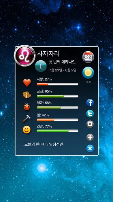 다음 인생 영역에 대한 사용자의 별자리 성향을 한눈에 파악할 수 있습니다: - 사랑 - 금전 - 운수 - 직업 - 건강 다음과 같은 모든 고전적인 12 별자리에 대한 낮과 밤의 개별 예측을 포함하여 3가지 데카나잇(Decanate)이 제공됩니다: 양자리, 황소자리, 쌍둥이자리, 게자리, 사자자리, 처녀자리, 천칭자리, 전갈자리, 사수자리, 산양자리, 물병자리, 물고기자리. 이외에도 이 응용 프로그램은 또한 자신과 해당 특정 날의 자신의 감정을 보다 잘 알 수 있도록 돕는 구절을 표시합니다. 지금 다운로드하여 사용해 보십시오. 일상생활에서 자신과 다른 사람들을 더 잘 이해할 수 있습니다!