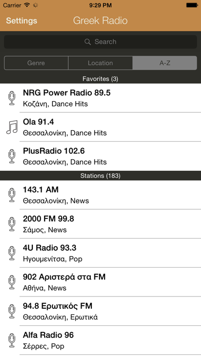 Listen.Feel.Share.- Greek Radio is a great choice for anyone who likes to listen to live radio and especially greek music. Greek Radio connects you to radio stations around Greece. Choose from a wide range of stations that play music in your favorite genre. You can listen to talk shows, politics and sports. The application offers over 200 stations that you are able to listen to, simply by using your iPhone's, iPod's Touch or iPad's WiFi or 3g. Got something on your mind? "Search" for it. If you know what you want, simply search for a station, a location or a genre and it will show you a list of stations based on what you're looking for. An alternative way to select a radio station is by double tapping on the genre that you see on the list and you get all the stations of your selected genre. New features on this update, is the ability to visit the station website and secondly mark a station as a favorite to save it. You can succeed that by tapping and holding the station. In the new Settings area, you can select the "Shuffle to play music" option and you will be able to shake your phone and listen to a random station. Listen to your preferred radio producers and their show, read the title of the song and the name of the artist when passing under the station name in the "Now playing" screen. Enjoy listening to Greek Radio while drinking a cocktail in the beach, preparing dinner at home, sitting on a train or at work. Please do not hesitate to contact us anytime, thru the app, for any new station suggestion you may have! List of stations: - 105.5 Rock FM - 143.1 AM - 2000 FM 99.8 - 4U Radio 93.3 - 80's Mania - 902 Αριστερά στα FM - 94.8 Eρωτικός FM - Alfa Radio 96 - Amore FM 87.5 - Arena FM 89.4 - Athens DeeJay 95.2 - Athletic Radio - Atlantis 105.2 FM - Biscuit Radio - Cavo Paradiso - Cool FM 106.5 - D-Code 96.2 - Deezer Radio 100.6 - Desperado Radio - Echoes Radio - Ellinikos FM - Energy FM 101.0 - Energy FM 88.3 - FM Life 105.3 - Future Radio - God Radio - Heart FM 103.5 - Imagine 89.7 - Indieground Radio - Ionian Galaxy 90.8 - Just Radio 93 FM - Karamela Radio - Kiss FM 96.1 - Larissa DeeJay 95.8 - Legend FM 101.6 - Libero 107.4 - Life Radio FM 102.9 - Loud Radio 88.8 - Mad Radio 107 - Maximum FM 93.6 - Metropolis 95.5 - Music FM 105.8 - Notos FM 101.8 - NRG Power Radio 89.5 - Ola 91.4 - Open Radio - Palmos On Air 105.4 - Piqeras Deejay 105.6 FM - Play FM - PlusRadio 102.6 - Pop FM 102.1 - Power FM 100.2 - Prime Radio 100.3 - Procka FM 93.4 - Radio 1 88 FM - Radio 1 FM 100.1 - Radio 98fm - Radio Alpha Omega 90.4 - Radio Creta - Radio Energy 96.6 - Radio Greece - Radio Relax - Radio Δραμα 99.1 - Rainbow 89 FM - Real FM 107.1 - Republic 100.3 - Rock FM 96.9 - Rockarolla - RSO 91.7 - Sfera 90.7 - Skyline FM 98.2 - Sohos FM 88.7 - Space FM 107.5 - Star FM 88.8 - Studio 3 103.6 - STYL FM 104.8 - Sunshine FM 107.7 - Super FM 108 - Super Radio 90.4 - Traffic FM 91.8 - Tuning Radio - Venus FM 105.1 - Venus Radio 99.3 - Viva FM 95.3 - Wave Radio 97.4 - Xronos 87.5 - Zbutsam Radio - Zoo Radio 90.8 - Ακτίνα FM 107.6 - Αρμονία - Αρτεμης FM 94.4 - Γλέντι FM 101.1 - Ελληνικός 90.3 - Ερωτικός 99.5 - Ζυγός FM 100 - Καλαμαριά FM 101.7 - Καστοριά FM 91.5 - Κοσμοράδιο 95.1 - Κόσμος FM 100 - Κρήτη FM 87.5 - Κύμα FM 90.3 - Κυπαρισσία 93.6 - Λαϊκός FM 105.7 - Λάμψη FM Radio - Λελέβωσε 101.3 FM - Λέσχη 97.6 - Λέχοβο 97.1 - Λουτράκι 96.9 - Μουσική Λάμψη 103.3 - Μουσικό Πανόραμα 100.8 - Μύθος στα FM 93.4 - Νότος 94.9 - Ξενύχτης - Παλμός FM 104.2 - Ράδιο 88 μισό - Ράδιο Αμύνταιο - Ράδιο Γνώμη FM 93.7 - Ράδιο Έβρος 97.1 - Ράδιο Έκρηξη FM 99.8 - Ράδιο Επτάνησα 98.8 - Ράδιο Ήπειρος 94.5 - Ράδιο Θάλασσα - Ράδιο Θεσσαλονίκη 94.5 - Ράδιο Κιβωτός 87.8 - Ράδιο Ξηρόμερο 88.3 - Ράδιο Πιερία 104.2 - Ράδιο Πόλις 99.4 - Ράδιο Τύρναβος FM 103.8 - Ράδιοενέργεια 106.4 - Ραδιοκύματα 104.4 - Ρυθμός 89.2 - Σκάι FM 92.6 - Στυλίδα FM 94.1 - Τσιρίγο FM 105.6 Greek Radio is compatible with the iPhone, iPod touch and iPad. It requires iOS 5.0 or later.