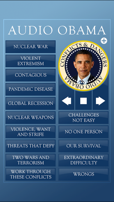 Audio Obama allows you to play and listen to over 200 audio quotes from Barack Obama, the 44th President of the United States of America. Be inspired and entertained by this century's most dynamic world leader. Each of the 14 pages contains 15 audio phrases, easily playable at the touch of a button. Click on Obama's picture to play a random quote. Enjoy listening to such classic quotes as: - "Wazzap!" - "Just one more problem I've inherited from George W Bush" - "'Inside the Obama White House' is my my favorite new show. There's just something really compelling about the main character." The 14 pages are categorized as follows - Jokes & Humor 1 - Jokes & Humor 2 - Be Obama 1 - Be Obama 2 - Be Obama 3 - Positivity - Wisdom & Advice 1 - Wisdom & Advice 2 - Wisdom & Advice 3 - Conflicts & Dangers - The Economy & Greed - Inaugural Speech 1 - Inaugural Speech 2 - Inaugural Speech 3