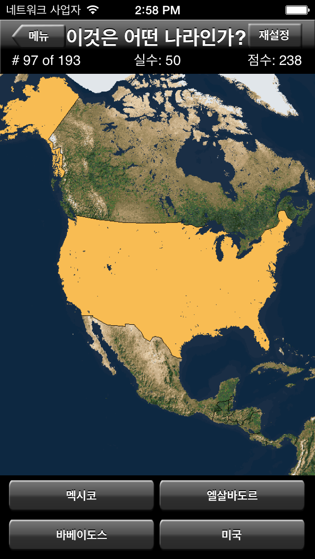 "국가지도 퀴즈" is the Korean localization of the "Country Maps Quiz" game. This is a geographical quiz which invites you to test your knowledge of countries around the world. It may be used for testing and educational purposes for people well-informed about the map of the world. Game contains all the 193 countries of the world. Each question has 4 possible answers. When you tap one of the answers, the default color of the pressed button is changed to green (when it was the right answer) or to red (wrong answer). You have 3 attempts to give the right answer. If you give it at the first attempt you will receive 3 points, at the second attempt - 2 points, at the third - 1 point. Play the "국가지도 퀴즈" quiz now and find out how well you know your world!