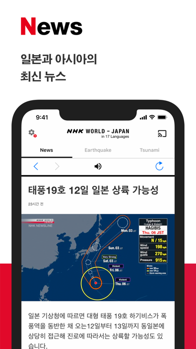 NHK WORLD-JAPAN은 일본의 공공 방송사 NHK의 국제 서비스입니다. 텔레비전, 라디오, 온라인을 통해 일본과 아시아에 대한 최신 정보를 전 세계 시청자에게 전해드립니다. [제공 서비스] - 17개 언어로 시청 가능 아랍어, 벵골어, 버마어, 중국어, 영어, 프랑스어, 힌디어, 인도네시아어, 코리언, 페르시아어, 포르투갈어, 러시아어, 스페인어, 스와힐리어, 태국어, 우르두어, 베트남어 - 일본과 아시아의 최신 뉴스 - 지진 및 쓰나미 속보 푸시 알림 *영어와 중국어 - AI 번역을 통한 다중언어로 영어 TV 채널 24시간 실시간 방송 - 다양한 언어를 지원하는 비디오와 오디오 골라 보기