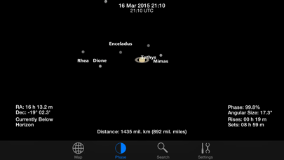 Explore 3D globes of Saturn's moons Use pinch and finger gestures to manipulate a 3D globe of one of seven of Saturn's moons. As you zoom in more labels appear as finer detail comes into view. You can double tap on the labels to get more information about a particular feature. Saturn Atlas displays the approximate phase, axial tilt and central meridian of the selected moon from your chosen location and time, and renders these on the globe. You can switch to a 'Globe' mode that allows you to spin the moon around to see the whole globe. The feature database is searchable and can move the globe to a searched feature. The phase can be switched off to show the whole globe more clearly. The moon's globe can be shown with north or south at the top or inverted to suit different telescope views. Over 440 named features across seven moons are included. These moons are Dione, Enceladus, Iapetus, Mimas, Rhea, Tethys and Titan. The phase view shows the current view of Saturn itself including the tilt of the rings. You can swipe left and right on the phase view to go backwards and forwards a day. When you turn the device to landscape mode a wider view is shown with the moons in their approximate positions for the time selected. Date, time and location can be changed. There is also a realtime mode that will update to the current time. Atlases for the Moon, Mars, Mercury, Venus and Jupiter are also available on the App Store!