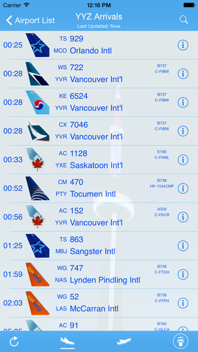 Real-time Canadian Airports flight information. Flight arrival and departure time, flight status and destination are synchronized with your iPhone (iPhone 6, iPhone 6 Plus) and iPad. Cover all Civil airports in Canada Features: • Advanced search tools for flight, status and destination information. Simply enter ANY keywords to filter out your flight. • Universal - natively support both iPad and iPhone • Friendly - show airline tail for the ease of looking for your flights. All flight information at your fingertips!