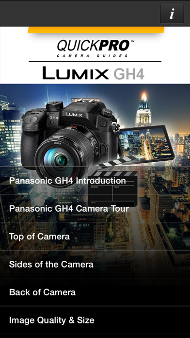Shoot amazing video and photos with the revolutionary Panasonic Lumix GH4. Now you have ready to go instruction of all camera functions where you need it and when you need it. Really want to capture the Colosseum and Pantheon on your trip to Rome? Take along your iPad and, while you're on the plane, enjoy a Pro training session with a QuickPro Camera Guide specialist. It's as easy as picking up the phone. Provides: - Instructional video on all aspects of the Panasonic Lumix GH4 and photography. - On the go video playback. No WIFI required after initial install for watching in the field. Subjects Include: - Panasonic GH4 Introduction - Panasonic GH4 Camera Tour - Top of Camera - Sides of the Camera - Back of Camera - Image Quality & Size - Metering, Exposure & Release Modes - Metering - Intelligent Auto Modes - Creative Control Modes - Advanced Shooting Modes - Shooting Modes & Exposure - Drive Modes - Display Settings & Movie Recording - Display Settings - Recording Movies - Playback - Basic Playback - Playback Displays - Focus Modes & Image Sharpness - Autofocus Modes - Autofocus Areas - Other Factors of Focus - Menu System Tour - Recording Menu - Motion Picture Menu - Custom Menu - Setup Menu - Playback Menu - Controlling Color & Tone - White Balance - Photo Styles - Using the Built-in Flash - Flash Modes - Flash Compensation - Using the Built-In Wi-Fi - Wi-Fi Functions