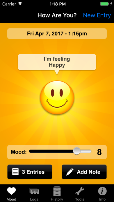 Best Health App 2011 - 2nd Place - bestappever.com The perfect companion for tracking your moods and emotions, and everything else that can affect how you feel. The fun yet powerful design will help you understand what causes your emotions to change, and get you on the path to feeling good. Features: - Track mood and emotional state throughout the day - Track many items to see how they affect your mood, including sleep, exercise, medication, menstrual cycles, stress, pain, energy and stimulants - Take notes for more detail - Comprehensive reminder system, no more gaps in your history - Protect your data with a 4 digit PIN - Online backup/restore - Easily back-enter data for other days - Hourly, daily, weekly, monthly and yearly charts of everything you've entered - Full history log - Export history to email/spreadsheet - Full developer support. If you want something added, we'll do our best to accommodate. Keeping track of how you are feeling is an important step in improving your mental health and well being. If you want to work towards feeling better each day, MyMoodTracker can help get you there.