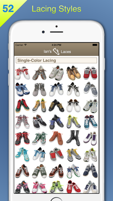 HOW DO YOU LACE YOUR SHOES? Do you just use an "ordinary" lacing method? You may be surprised at what's possible! You have found, without a doubt, the most awesome collection of shoe lacing methods. Cool, trendy methods. Useful, practical methods. Unusual, special purpose methods. "Ian's Laces" includes 52 different lacing methods, many with several variations, for a total of 112 possibilities. Compiled by Ian "Professor Shoelace" Fieggen, creator of the web's number one site about shoelaces, this app brings together more than a decade of lacing research. Plus, you'll also get exclusive methods not available on Ian's web site (or anywhere else). Each method includes one or more clear, color-coded diagrams plus detailed, step-by-step instructions and helpful tips. Everything is included - NO Internet access is required. What's more, you can design your own patterns! Just as quickly as you can drag your finger, our virtual laces snap to the eyelets of a virtual shoe. It's all about your creativity, so you can export or email your best "lace art" with ease. With "Ian's Laces", your footwear will never be "ordinary" again. And if someone does ask: "How did you do that?", the answer is at your fingertips, not your feet.