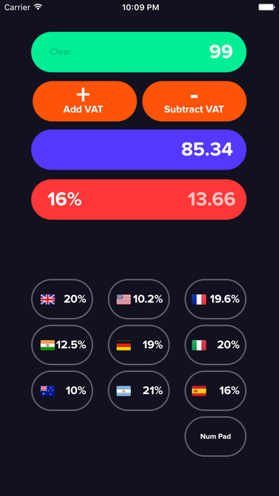 Calculate VAT using a Simple VAT system. Either add or takeaway vat with a click of a button. • 100% FREE Vat percentages added for the following. • UK • USA • France • India • Germany • Italy • Australia • Argentina • Spain It's simple and sleek - Download and keep on your device for next time you need to quickly work out VAT. • Saves State - Saves where you close so on return just start working. • Simple, Sleek, Design • Best of all it's free