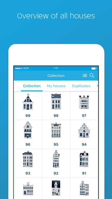 KLM Houses Forget about the crumpled notes - download this app to store all your collected KLM houses. This app contains all miniature houses and provides, amongst others, the following functionalities: - A scanner to find your house easy and fast; - An overview, including image gallery, of all houses; - Add notes so you can store every fond memory about the houses; - Have duplicates? Keep track of how many houses you own; - Read all about the history of all the houses; - Find the location of the houses on Google Maps!