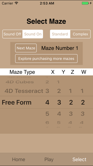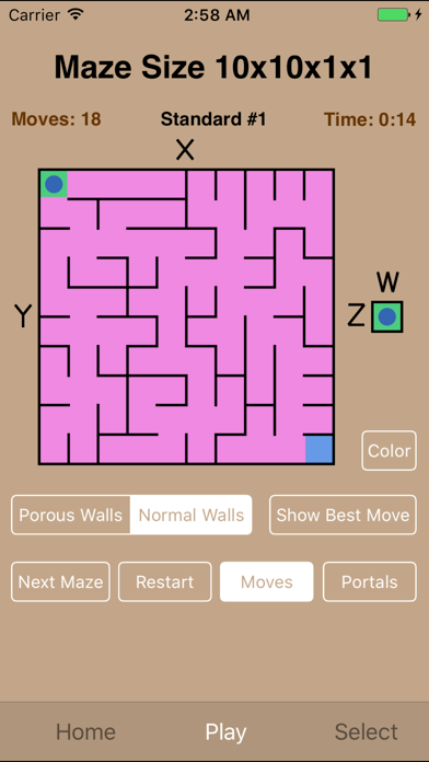 A free multidimensional maze game for the both iPhone and iPad. Many different sizes - Squares, Cubes, 4-dimensional Tesseracts, and mazes with any size sides like 5x2x7x3 or a double stacked square - 10x10x2. 1 dimensional lines 2 dimensional squares - up to 40x40 on the iPad, 20x20 on the iPhone 3 dimensional cubes - up to 40x40x40 on the iPad, 20x20x20 on the iPhone 4 dimensional tesseracts - up to 20x40x40x20 on the iPad, 10x20x20x10 on the iPhone Optional: Show Best Move, Make Best Move Optional: Porous Walls, Moves remaining indicator, Show Portals Combines Kramer&Kramer Apps MazeLine, MazeSquare, MazeCube and MazeTesseract into one App. And much much larger mazes can be selected on an iPad. Prior to upgrade, this free version allows 2 mazes of each size and complexity level (e.g. 4 mazes 17x17, 4 mazes 5x2x7x3, 4 mazes, 4 mazes 8x11x2x2, etc.). After upgrade there are 100 mazes of each size and complexity level. Screenshots: 1) a small 2-D maze 2) a large 2-D maze 3) a 3-D maze 4) a 4-D maze (4x3x2x2) 5) Select Maze screen