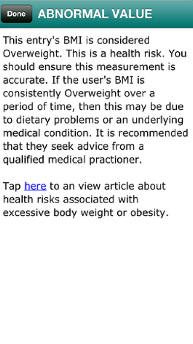 Your Height Weight is a comprehensive self monitoring application that allows you to record and monitor weight, height or body mass index over various time intervals. The software also allows markers to be set for various events such as periods of exercise, changes in diet, medication or other markers of your choice. All measurements are automatically evaluated against current recommended standards and abnormal results are flagged for your attention. All measurements can be viewed in graph or chart form, allowing easy recognition of trends or deviations from normal values. Markers used to identify changes in diet, lifestyle or other selected factors are clearly identified on the graphs and charts, allowing easy recognition of any effect of these changes on weight, height or BMI. One of the unique factors that sets this application apart is the ability to synchronise your recorded measurements with your online health record. This allows automatic uploading of all data to be safely stored with other health information in YourHealthRecord. This service is complimentary and provided free of charge. This application is ideal for anyone who wants to monitor the effects of changes to lifestyle, diet, exercise etc on weight or BMI. It is also useful for monitoring the effects of medication or flagging significant changes or abnormal values which may be indicators of underlying disease. Your Height & Weight was developed by one of Australia's leading private hospital companies with over 60 years combined experience in the provision of health care. See our app store for many more exciting iPhone & iPad products.