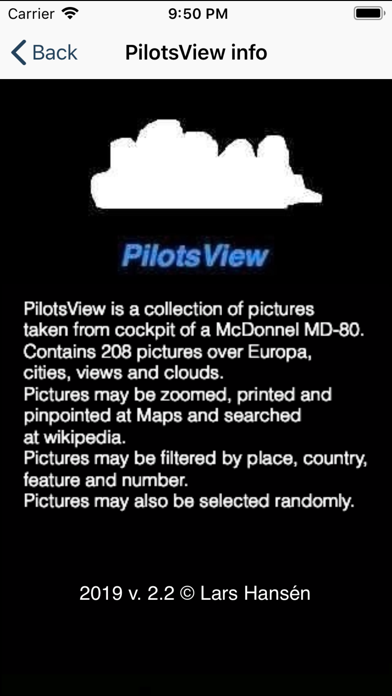 -PilotsView is a collection of pictures taken from a commercial passenger jet’s cockpit during normal flight operations. -The App provides views rarely visible from the passenger’s seat. Contains 208 pictures over Europa, cities, views and clouds. Pictures may be zoomed, printed, shared, pinpointed at Maps and searched at wikipedia. Pictures may be filtered by place, country, feature and number. Pictures may also be selected randomly. -PilotsView är en samling bilder tagna från cockpit under normal linjefart. -Bilderna visar vyer som ofta inte syns från passagerarsätet. Innehåller 208 bilder över Europa, städer, utsikter och moln. Bilderna kan zoomas, printas, delas, visas på kartan samt sökas på wikipedia. Bilderna kan filtreras efter plats, land, typ och nummer. Bilderna kan också väljas slumpartat.