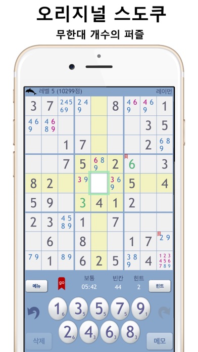 세계 최고의 아이폰/아이패드용 스도쿠 게임 편리한 게임 진행과 상상할 수 있는 거의 모든 기능을 제공합니다. 무한대 개수의 퍼즐을 제공하여 평생 새로운 게임을 즐길 수 있습니다. 매일매일 스도쿠 세계 대전 기능 - 5가지 유형의 스도쿠를 한App에 담았습니다. 오리지널 스도쿠 비교 스도쿠 합계 스도쿠 연산 스도쿠 기호 스도쿠 - 데일리 스도쿠 매일 전세계 사용자와 동일한 스도쿠 경쟁하기 - 페이스북/트위터 연동 페이스북에 기록 공유 페이스북에 퍼즐 공유 트위터에 기록 공유 트위터에 퍼즐 공유 - 게임 다시하기, 다시보기 - 모든 레벨에서 무한대개수 퍼즐 제공 100개, 1000개의 게임만을 제공하는 App과는 다르게 무한대의 퍼즐을 제공하여 평생 게임을 즐길 수 있습니다. - 게임 레벨을 선택할 수 있습니다. "아주 쉬움"에서 "아주 어려움"까지 총 5개의 레벨을 선택할 수 있습니다. 스도쿠를 처음 하시는 분도 쉽게 게임을 할 수 있습니다. - 자동 저장 기능 게임의 상태가 항상 자동 저장이 되어서 다음에 재시작 시 항상 마지막 화면을 보여줍니다. - 후보 숫자를 적을 수 있는 메모 기능 정답을 바로 알 수 없는 칸에는 후보 숫자를 입력하여 게임의 진행을 도와주는 메모 기능이 지원됩니다. - 자동 메모 기능 메모를 자동으로 표시하여 게임을 빠르게 진행할 수 있습니다. - 게임 성적 기록 게임의 성적이 기록되고 관리됩니다. - 게임 초기화 기능 게임을 망쳤을 경우 처음으로 되돌리는 기능이 있습니다. - 무한 되돌리기 기능 Undo/Redo 기능을 제공하여 직전으로 되돌아 갈 수 있습니다. - 다중 북마크 기능 북마크를 이용하여 저장된 위치로 빠르게 이동할 수 있습니다. 북마크는 5개까지 저장할 수 있습니다. - 5개언어 지원 (영어, 한국어, 일본어, 중국어간체, 중국어번체) - 힌트 기능 결정적인 칸의 정답을 알려주는 힌트 기능이 있어서 게임이 어려울 때 활용할 수 있습니다. 힌트는 20분마다 하나씩 늘어납니다. - 중복 숫자 표시 기능 실수로 중복된 숫자를 입력했을 경우 중복된 숫자의 색을 다르게 표시하여 게임의 진행을 돕습니다. - 레티나 디스플레이 완벽 지원 아이폰4,5 레티나 디스플레이를 지원하여 선명한 화면을 제공합니다. - 화면을 더블탭하면 메모모드로 변환 메모버튼을 누르지 않아도 화면에서 더블탭을 하면 메모모드로 바뀝니다. - 비교해야 할 칸을 표시 중복된 숫자를 입력할 수 없는 칸은 다른 색으로 표시하여 숫자를 비교하기 쉽게 합니다. - 게임센터 연동 전세계 순위 확인, 레벨별 최단 시간 순위 확인 - 다양한 설정 화면 효과음 켜기/끄기, 언어 변경 - 피드백 기능 버그나 의견을 리포트하고 개발자와 대화할 수 있습니다. - iOS8 지원 - iPhone 6, iPhone 6 Plus 지원 - 세계 순위 페이지