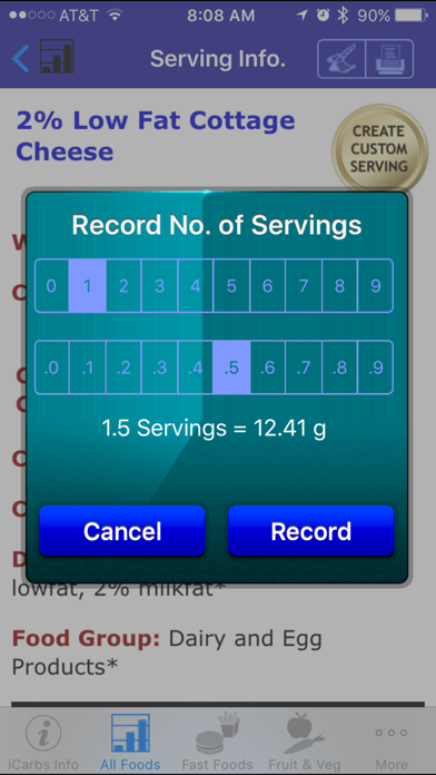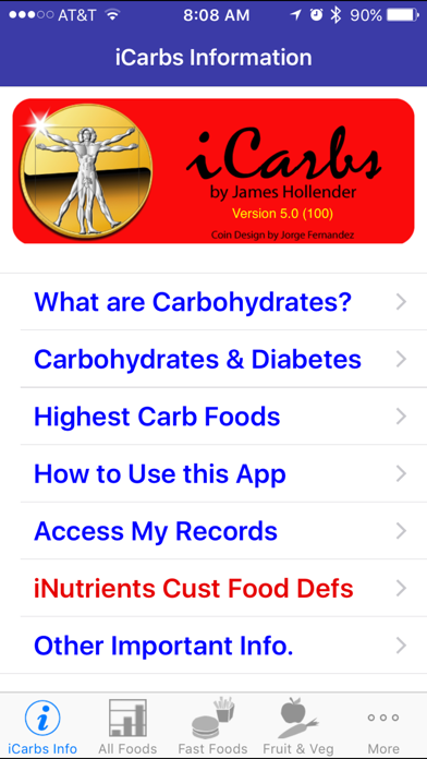 iCarbs is one of 10 iNutrient apps based on the USDA National Nutrient Database. The others include: - iCholesterol (Dietary Cholesterol) - iFiber (Fiber) - iKals (Calories) - iPotassium (Potassium) - iProteins (Proteins) - iSatFat (Saturated Fat) - iSodium (Sodium) - iSugars (Sugars) - Vitamin K (Vitamins K1, K1D & K2) As of version 3.0 this app allows users to record their intake of the nutrient The information is maintained for one year and is presented in reverse chronological order grouped by day, so the latest data is presented first in the list. Editing allows for: 1) changing the number of servings; 2) changing the date; and 3) deleting records. If you are either a bodybuilder or have diabetes this is an app you will truly make use of on a regular basis. The iCarbs app provides information about foods and how they are rated for carbohydrate content. This is provided as a means to assist in deciding which foods to eat. If you are a bodybuilder, you probably want to have a high intake of carbohydrates, but on the other hand if you have diabetes you need to make sure you don't exceed your recommended daily amount of carbohydrates. The food servings are rated from EXTREMELY LOW in Carbohydrates all the way up to EXTREMELY HIGH. The following colors help readily identify which is which: - Black = Rated EXTREMELY HIGH in Carbohydrates (Carbs) (45.01 - 166.46 g) - Dark Red = Rated VERY HIGH in Carbs (30.01 - 45.00 g) - Red = Rated HIGH in Carbs (15.01 - 30.0 g) - Orange = Rated MODERATELY HIGH in Carbs (12.01 - 15.00 g) - Yellow = Rated MODERATE in Carbs (9.01 - 12.00 g) - Yellow-Green = Rated MODERATELY LOW in Carbs (6.01 - 9.00 g) - Green = Rated LOW in Carbs (3.01 - 6.00 g) - Cyan = Rated VERY LOW in Carbs (0.01 - 3.00 g) - White = Rated EXTREMELY LOW in Carbs (0.00 g) Essentially, the cooler the color, the lower the amount of Carbohydrates, with white being the coolest color and black being the hottest (think burnt). There are eight tables listing food servings: - All Foods - Fast Foods - Fruits & Vegetables - Meat, Fish & Shellfish - Dairy & Egg - Cereal Grains & Pasta - Sweets - Snacks The All Foods list allows you to search by any word or partial word from all the Food Titles. Selecting a food in any of the tables will display pertinent information about the selected food serving: - Food Title - Weight (in grams) - Common Measure (serving size for weight) - Protein Content (in grams) - Calories - Percentage of Protein by Weight (if at least 1%) - USDA Description - USDA Food Group - USDA Nutrient Database Number Information is derived from the USDA National Nutrient Database for Standard Reference: Carbohydrate Content of Selected Foods per Common Measure. There are currently over 1,100 different foods included, searchable using more than 2,500 names (some foods are known by different names or how they are prepared, e.g., "Egg, Fried" and "Fried Egg"). A few these have as many as six searchable names. The iCarbs Info screen provides access to additional information pages: - What are Carbohydrates? - Carbohydrates & Diabetes - Highest Protein Foods - How to Use this App - iNutrients Custom Food Definitions (another app with more features and data for 10 nutrients) - Other Important Info. (includes allowance to 1) Report a Problem; 2) Ask a Questions; and 3) Make a Suggestion)