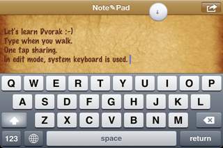 This awesome notepad app supports typing-while-walking, Dvorak, iPad-friendly keyboard, sharing, and a lot of cool features! Download it for FREE and find the following features: - Use camera to type-while-walking - Flashlight supported - Zoom-able keyboard for iPad users - Qwerty and Dvorak keyboard layouts - User can create their own layouts - Sharing via clipboard, mail, sms, and facebook - The IME button can be dragged anywhere IMPORTANT DISCLAIMER Continued use of the flash may dramatically decrease battery life.