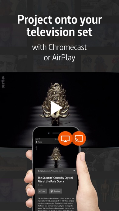 Compatible with AirPlay and Chromecast Documentaries, reportages, magazine shows and concerts, all on the ARTE app. Watch your favourite ARTE shows whenever and wherever you want. A whole world of ARTE in one App New programmes every week: documentaries on social issues and engaging exposés. Reportage, live concerts and more… Find what you want to watch by browsing our categories. Are you a Binge-watcher? With automatic play you don’t need to move. We will automatically play the next episode for you. Sit back and relax. Watch ARTE offline With our download option you can now watch ARTE programmes offline. That means on the plane, on the beach or wherever you like. Download videos by pressing the download button (before you go off grid). Your downloads are stored in your “MyARTE” space for 72 hours and are accessible abroad. Linkup to your TV screen If you have a Chromecast key or Apple TV you can connect the ARTE app to your TV screen. Just click on the ‘Cast’ icon in the video player. MyARTE In your “MyARTE” space you can continue watching videos from where you left off, select your favourites and add content to watch later. Language - Choose your language by clicking on the cog on the bottom-right of the video player. (English, French, German, Spanish, Italian, Polish). You can also change languages in the app settings. For optimal performance the ARTE app needs to access to - Calendar in order to add upcoming programmes - Bluetoothfor access to Chromecast - Microphone to configure Chromecast Authorisation for access will be asked when you navigate the app. You can refuse access at any time. If you have any comments or suggestions https://www.arte.tv/sites/en/corporate/users-guide/contact/ For legal reasons some of our programmes are only available in France and germany whereas others are only available in Europe.