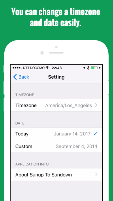 This app is a simple utility that calculates sunrise and sunset times. It shows times which you drop a pin to the map. You can bookmark any location on map and see the information just as quick. Features: - Display sunrise and sunset times - Bookmarking function - Get current location by GPS - Use current date or selected date - Use a timezone currently selected for you device, or select a timezone manually