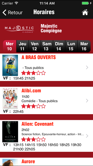 Retrouvez à chaque instant toute l’info de votre cinéma Majestic sur votre iPhone ! Les films à l’affiche, les horaires des séances, les fiches films et les événements et infos pratiques de votre cinéma ! TOUS LES FILMS DE VOTRE CINEMA MAJESTIC Les horaires des séances Les films à l’affiche Les films dans l’heure Les avant-premières et événements Les films à venir DES FICHES FILMS TRES COMPLETES Affiches, photos et bandes annonces haute qualité Genre, durée, casting et date de sortie Synopsis TOUTE LES INFORMATIONS UTILES Ajoutez directement votre cinéma à vos contacts Consultez les tarifs Localisez et trouvez votre chemin vers votre cinéma Liste des Cinémas Majestic : - Espace des lumières Vesoul - Majestic Douai - Le France Remiremont - Vox et Eden Chaumont - Majestic Compiègne