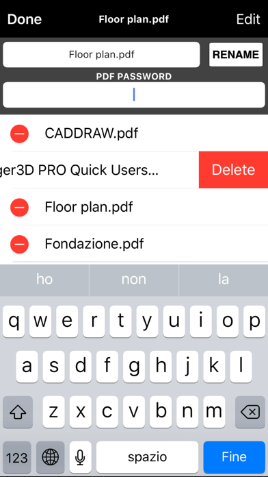"pdfManager" è un lettore di file "PDF". Con "pdfManager" sarà possibile: 1) memorizzare i tuoi file PDF sul dispositivo portatile 2) visualizzare in ogni istante ed in ogni condizione di lavoro i tuoi file PDF 3) convertire i file PDF (o anche parte di una pagina di un file PDF) nel formato immagine JPG/PNG 4) condividere i documenti PDF salvati nell'archivio di pdfManager con DROPBOX o altre applicazioni installate nel dispositivo 5) stampare pagine di file PDF (o parte di una pagina del file PDF) utilizzando il pulsante di stampa di pdfManager (AirPrint) 6) aprire e visualizzare documenti PDF protetti da password * Il software non ha bisogno di connessioni internet per funzionare: ogni file PDF viene memorizzato sul dispositivo portatile (utilizzando la tecnologia "iTunes File Sharing" oppure "Open In") e viene letto dal software stesso. * Il visualizzatore di PDF integrato lavora come il visualizzatore di immagini del dispositivo; si potrà quindi: - ingrandire/rimpicciolire il documento (ZOOM INFINITO) trascinando due dita sullo schermo (ogni volta che si usa lo ZOOM INFINITO la pagina PDF viene ridisegnata da capo garantendo così la massima qualità possibile anche visualizzando i minimi dettagli a tutto schermo) - spostare la visualizzazione del documento (PAN TOOL) trascinando un dito sullo schermo - azzerare le impostazioni attuali di ZOOM e PAN tramite doppio tocco sul display - cambiare pagina velocemente utilizzando i due pulsanti "pagina successiva" e "pagina precedente" oppure digitando il numero della pagina desiderata con la tastiera del dispositivo - cambiare in ogni istante il file PDF da visualizzare caricandolo dall'archivio dei file PDF di pdfManager (i file PDF salvati in archivio sono elencati in ordine alfabetico) - salvare infiniti file PDF nell'archivio di pdfManager (fino ad esaurimento della memoria fisica del dispositivo) - utilizzare la modalità di lettura Portrait o Landscape (ruotando il dispositivo) - visualizzare il documento PDF utilizzando la funzione slideshow (il tempo di visualizzazione tra una pagina e la successiva può essere regolato) Esempi di utilizzo per: 1) Utenti iWork : Pages, KeyNotes, Numbers 2) Utenti MS Office : Word, Excel, Powerpoint 3) Utenti CAD (disegni tecnici) 4) ecc… --> converti i tuoi documenti/disegni tecnici/progetti CAD in file PDF, copiali nell'archivio di "pdfManager" (utilizzando la tecnologia "iTunes File Sharing" oppure "Open In"), visualizzali ovunque con "pdfManager" Con "pdfManager" avrai sempre a portata di mano i tuoi documenti, disegni tecnici, manuali, appunti, ecc…