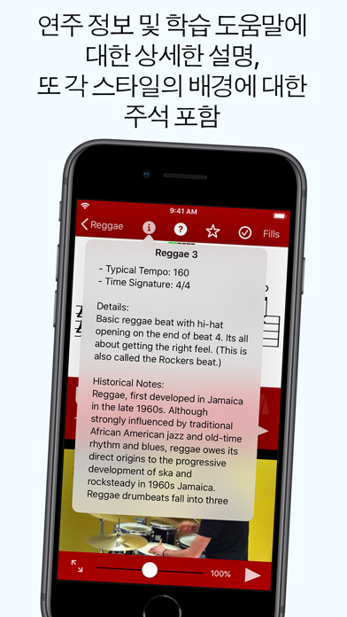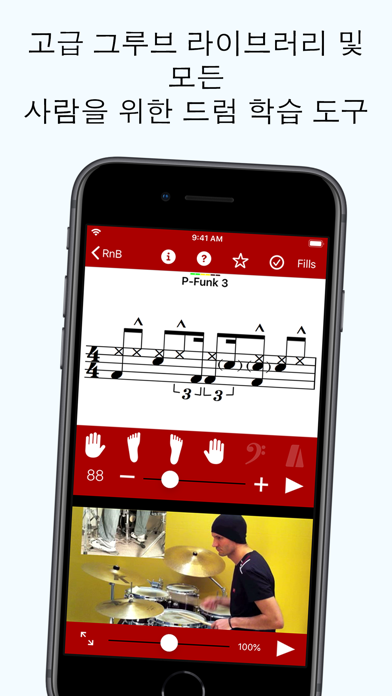 고급 그루브 라이브러리 및 모든 사람을 위한 드럼 학습 도구 Drum School은 초보자는 물론 전문가도 드럼 연주를 보다 세련되게 다듬어 줄 완벽한 툴입니다. 다양한 종류의 그루브와 연습 방법을 통하여 Drum School이 더 나은 연주를 도와주고, 또 쉽게 이용할 수 있는 프로페셔널한 음질의 그루브 라이브러리가 반주용으로도 또는 참조용으로 완벽한 툴이 됩니다. 포함된 스타일: 록, 록큰롤, 올터너티브 록, 헤비메탈, 펑크(Punk), 블루스, 알앤비, 힙합, 펑크(Funk), 레게, 스카, 디스코, 드럼 앤 베이스, 하우스, 테크노, 컨트리, 블루글래스, 재즈, 스윙, 딕시랜드, 랙타임, 퓨전, 뉴올리언즈, 탱고, 보사 노바, 삼바, 아프로 쿠반, 스쿠스, 칼립소, 왈츠 등. ~ Modern Drummer 및 DownBeat 매거진에 특집. ~ Drum School은 그루브, 연습, 히트, 기술 및 즐겨찾기의다섯 부분으로 나뉩니다. 그루브 Drum School의 주요 부분으로서 다양한 스타일을 갖춘 300개의 드럼 그루브로 구성됩니다. 각 그루브 특징: - 고화질 그래픽의 기본 드럼표기법을 세로 모드와 가로 모드로 모두 이용가능. - 고음질의 실제 드럼을 이용한 샘플들로 연습용 반주를 위한 반복 가능. - 음질의 손실 없이 30부터 300bpm까지의 템포 조절 가능. - 양팔다리 각각의 오디오 분리가 가능하여 그루브를 부분적으로 나누어 연습한 후 다시 다양하게 조합 가능. - 모든 드럼 그루브가 베이스와 함께 연주되어 드럼과 베이스의 관계를 재미있게 배우고 경험는데 도움. - 앱 저작가와 세계적으로 알려진 드러머, 페렝크 네멧이 직접 연주한 고질의 동영상 포함. 동영상 속도는 조절 가능하며 보다 복잡한 그루브를 느린 템포로 연주한 동영상이 추가됨. - 개별적으로 또는 2, 4, 8 마디 악절과 같이 연습할 수 있는 다양한 드럼 필. - 1 (쉬움)에서 6 (어려움)까지의 난이도를 색으로 표시. - 연습 경과를 더 잘 관리할 수 있도록 완료한 그루브에 표시할 수 있음. - 연주 정보 및 학습 도움말에 대한 상세한 설명, 또 각 스타일의 배경에 대한 주석 포함. 연습 145개의 드럼 연습은 기초, 롤, 플램, 드래그, 손 동작 연습으로 구분됩니다. 각 연습 특징: - 고화질 그래픽의 기본 드럼표기법을 세로 모드와 가로 모드로 모두 이용가능. - 고음질의 실제 드럼을 이용한 샘플들로 연습용 반주를 위한 반복 가능. - 음질의 손실 없이 30부터 300bpm까지의 템포 조절 가능. - 왼손 및 오른손의 오디오 분리. - 속도 조정이 가능한 고품질 동영상 데모. - 연주 정보 및 학습 도움말에 대한 상세한 설명. 기술 드럼 연주를 위한 기본 손기술 및 발기술에 대한 12개의 데모. 각 동영상에는 상세한 정보 및 학습 도움말이 포함됨. 히트 이 섹션에는 고전적인 Pop, Rock 및 Funk 히트 곡이 포함됩니다. 각 그루브는 그루브 (Grooves) 섹션과 동일한 기능을 제공합니다. 즐겨찾기 맘에 드는 그루브 및 현재 작업 중인 그루브를 수집. 동영상 데모는 지원 웹사이트를 방문하십시오.