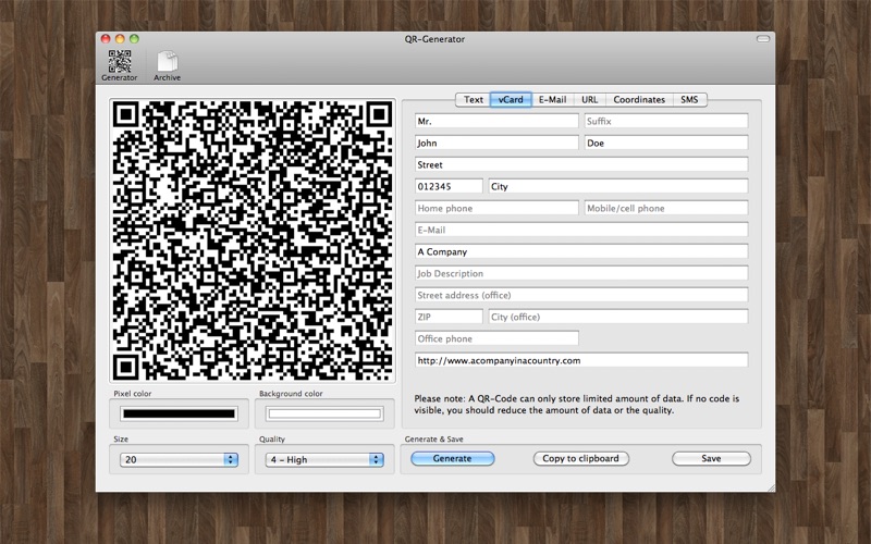 Note: This app is not compatible with macOS Sierra (10.12) or later. If you have bought this app although it doesn't work with your version of macOS, you can contact Apple to get a refund. People love QR-Codes. There are so much ways you can use them. Try it and impress your friends by sending them a little message or what about creating a special business card? Generated QR-Codes can be saved as PNG-Files. QR-Generator works without an internet connection.