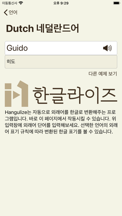 Hangulize는 자동으로 외래어를 한글로 변환해주는 프로그램입니다. 언어를 선택하고 외래어 단어를 입력해보세요. 선택한 언어의 외래어 표기 규칙에 따라 변환된 한글 표기를 볼 수 있습니다. 현재 35개 이상의 언어를 지원하고 있습니다. 지원되는 언어 목록: 아제르바이잔어, 벨라루스어, 불가리아어, 카탈루냐어, 체코어, 웨일스어, 중세 웨일스어, 독일어, 그리스어, 고대 그리스어, 에스페란토, 에스토니아어, 핀란드어, 세르보크로아트어, 헝가리어, 아이슬란드어, 이탈리아어, 일본어, 조지아어, 라틴어, 라트비아어, 리투아니아어, 마케도니아어, 네덜란드어, 폴란드어, 포르투갈어, 브라질 포르투갈어, 루마니아어, 러시아어, 슬로바키아어, 슬로베니아어, 스페인어, 알바니아어, 스웨덴어, 터키어, 우크라이나어, 베트남어