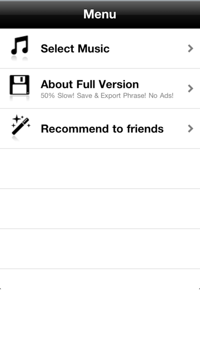 This App is the Music Dictation Player and the fastest, and easiest way to learn new songs by slowing down or speeding up play back without changing the pitch! Works with guitar, bass, trumpet, piano, voice or any other instrument and 'learn by ear'. It can be used for the listening of the foreign language, too. Other features: - change speed without any change in pitch.(75% to 150%) - change key.(-6 to 6 semitone) - change start time, end time keeping length.(dragging the red range rectangle) - realtime seeking.(drag orange play button) - speed, key, start time, end time can change without music pause! - repeat phrases **Upgrade to full version to get the following features : - No Ads. - Change Speed.(50% - 200%) - Save Phrase. - Export AAC Format. **Warning - Does not work with DRM protected songs(m4p)