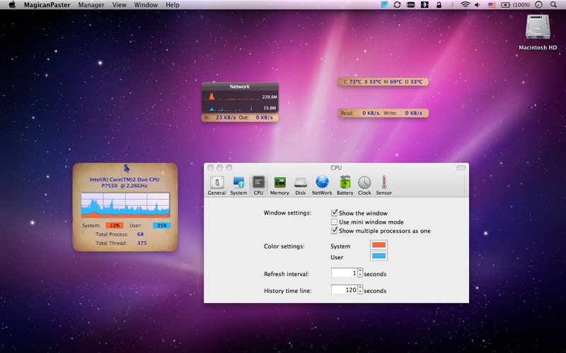 A useful mac system monitor which can help you get your mac’s running status all the time. FUNCTION MagicanPaster contains monitor parts include SYSTEM, CPU, RAM, DISK, NETWORK and BATTERY. With it, you may know much about your Mac, such as Mac and Battery serial number; CPU, RAM and DISK usage; Downloading and uploading rate of your network, etc. PERSONAL SETTING You may decide which monitor parts to be displayed by select at “Preferences”. You may choose minimize mode or normal mode for all monitor parts. Also you may change the refresh interval and history time line for charts. CHANGEABLE SKIN You may choose skin style of MagicanPaster as you want. USEFUL CLOCK HELPER We designed world clock parts within the software either for many people want to compare different time global, due to business and other requirements. MagicanPaster support display up to 4 clocks.