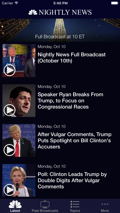 Stay on top of the day's biggest news stories, anytime, anywhere. Join the NBC Nightly News team seven days a week for top-notch political coverage, cutting-edge health and science reports, inspiring "Making a Difference" profiles, and all of the most important stories at home and around the world. - Watch the latest Nightly News reports. - See individual segments from the Nightly News broadcast or watch the broadcast in its entirety. - Catch up on past broadcasts of Nightly News. - Watch exclusive online videos. - Share stories with your friends via Facebook, Twitter, and Email. Get informed and stay informed with NBC Nightly News on your iPad and iPhone. This app features Nielsen proprietary measurement software which will allow you to contribute to market research, like Nielsen’s TV Ratings. To learn more about our digital measurement products and your choices in regard to them, please visit http://www.nielsen.com/digitalprivacy for more information.