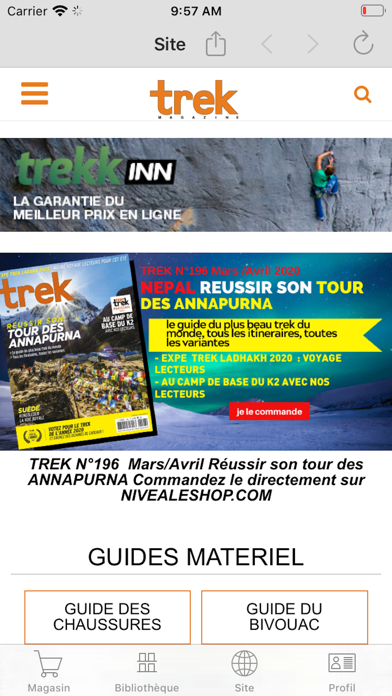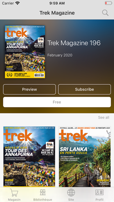 Avec Trek Magazine, le monde se découvre à pied. Retrouvez chaque mois les beaux treks du monde : déserts des Tassilis, royaume de Mustang, pays Massaï, montagnes sacrées des Incas, Grand Nord ou tout simplement l'Aubrac. Trek Magazine vous livre les clés de voyages d'exception avec des reportages détaillés, des guides pratiques, des tests matériel et des dossiers pédagogiques. Bref tout pour préparer et réussir votre prochain trek ! Profitez de l'abonnement « Full Access » pour accéder à l'ensemble des numéros : - Accès illimité à tous les numéros publiés - Formule d'abonnement auto-renouvelé automatiquement à la fin de la période par prélèvement sur votre compte iTunes, 24 heures avant la fin de la période en cours, et le prix du renouvellement sera indiqué. - Le paiement sera directement prélevé sur votre compte iTunes après la confirmation d'achat. - Les abonnements auto-renouvelés peuvent être gérés par l'utilisateur et le renouvellement automatique peut être désactivé en accédant aux paramètres de compte après l'achat et au plus tard 24h avant la fin de votre abonnement. - Il n'est pas possible d'annuler un abonnement pendant sa période de validité. - Lorsque l'abonnement est échu, l'accès aux magazines n'est plus possible. Pour plus d'informations sur les conditions générales d'utilisation : https://www.trekmag.com/app-store