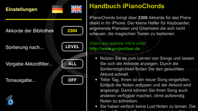 iPianoChords Info iPianoChords bringt über 2300 Akkorde für das Piano direkt in Ihr iPhone. Der kleine Helfer für Keyboarder, angehende Pianisten und Gitarristen die sich nicht scheuen, die magischen Tasten zu bedienen. Video und weitere Info's unter: http://www.projectizer.de - Nutzen Sie es zum Lernen von Songs und lassen Sie sich die Akkorde anzeigen. Durch die Sortiermöglichkeit finden Sie den gesuchten Akkord schnell. - Toller Tag, Ihnen ist ein neuer Song eingefallen. Einfach die Tasten antippen und der Akkord wird angezeigt. Damit können Sie Ihren Song auch anderen verfügbar machen. - Sie haben einfach keine Lust Notation zu lernen. Die Akkord Snapshot Funktion speichert den Akkord als Bild ab und Sie können Ihn in Ihr Songbook einfügen. Funktionen - Große Akkord Bibliothek - Jeweils mit Inversionen - Akkordwiedergabe - Piano Sample Sounds - Akkordfilter - Suchfunktion - Anzeige des Basistons - Anzeige der Töne im Akkord - Alternative Bezeichnungen - Anzeige der Akkordformel - Akkord Snapshot Funktion