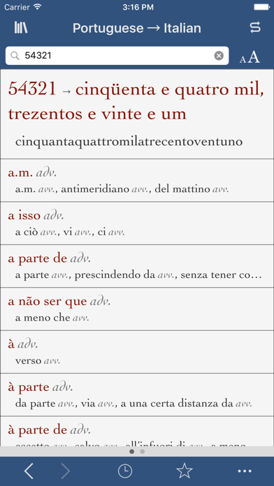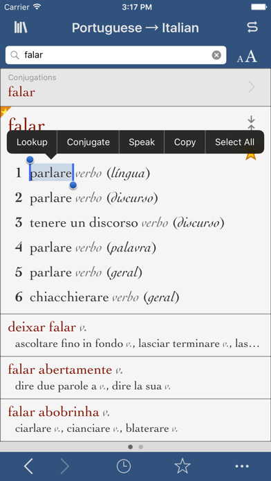 Top-selling dictionary app since 2008 • Every translation you need PLUS verb conjugations in all tenses • No internet connection required! "For serious language students and translators who are looking for more precision." - The New York Times Featured by Apple as "What's Hot" and "Staff Favorite" Ultralingua makes apps for people who love languages. Our Italian-Portuguese dictionary has all the definitions and translations you need, along with extra features that help you get the most out of the dictionary. The verb conjugation tool has complete conjugations for thousands of verbs in all standard forms, and the number translator converts numerals into Portuguese or Italian text instantly! DICTIONARY: • Over 50,000 entries with 244,000 translations • Tap-and-hold any word or phrase and choose "Speak" from the popup menu to hear that word spoken using Apple's built-in text-to-speech feature. • Noun genders • Slang, technical language, and regional differences in spelling and usage • Hundreds of usage notes about troublesome constructions • Smart search results in case you misspell or mistype • Search-as-you-go displays words and narrows your selection as you type VERBS: • Conjugations for thousands of Italian and Portuguese verbs • Includes all standard tenses and forms • Smart search finds infinitives and catches misspellings • Must-have reference tool for any student or language professional • On iPhone/iPod touch, conjugate a verb from the dictionary results by tapping it MORE: • Translate numerals into Italian and Portuguese text with the number tool • Language swapper button to switch from Italian-Portuguese to Portuguese-Italian • Tap the history button to view the 50 most recent dictionary definitions, verb conjugations, and more in one place. Sort the list alphabetically or by date, and choose to clear the list completely or delete one entry at a time. • No internet connection required • Change your device settings to view the app display in English, Spanish, French, Italian, Portuguese, or German View our reviews below to see why users love this app, and remember to let us know what you think! This universal app will run on iPad, iPhone, and iPod touch, so you can purchase it once and load it onto all your devices. The iPad and iPhone/iPod touch versions look and behave differently to give you a great experience on every device you own. The interface will change, but you’ll always have the same outstanding language data and tools inside. Dictionaries are available from Ultralingua for many languages, including combinations of English, Spanish, French, Italian, Portuguese, German, and more. See what else we have to offer by searching for Ultralingua in the App Store. Follow us on Twitter and become a fan on Facebook for app news, language learning tips, and more: http://www.twitter.com/ultralingua http://on.fb.me/ifI8Hy