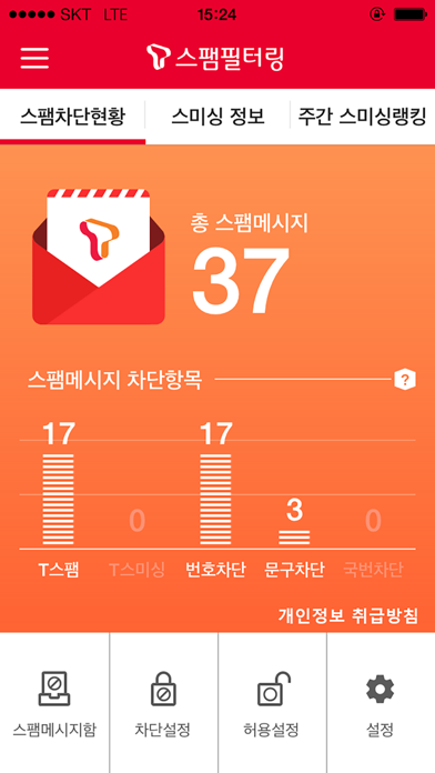 T스팸필터링의 아이폰 버전 출시~! - 본 어플은 SK텔레콤 가입자만 이용 가능 합니다. - WIFI 환경에서는 사용하실 수 없습니다. 3G 환경에서만 사용 가능합니다. - 정보 이용료, 데이터 사용료는 무료입니다. [주의] 해외로밍중에는 별도의 데이터 요금이 부과됩니다. ○ 주요서비스 - SMS 스팸필터링 서비스는 총 2가지의 수신 설정과 3가지의 차단 설정, 스팸필터링 데이터 관련 메뉴로 나누어져 있습니다. - 허용 번호, 허용 문구 설정은 정상 수신하고 싶은 번호 및 문구/단어를 총 40개 까지 등록하여 수신을 받습니다. - 차단 국번, 차단 문구 설정은 차단하고 싶은 번호 및 문구/단어를 총 200개 까지 등록하여 차단하며 060, 1588 등의 차단 국번 역시 수신 차단을 합니다. - 현재 아이폰 주소록에 등록된 번호를 통한 SMS를 전부 정상 수신하도록 하는 주소록 연동 기능 및 Email로 스팸데이터를 수신하도록 설정할 수 있습니다.