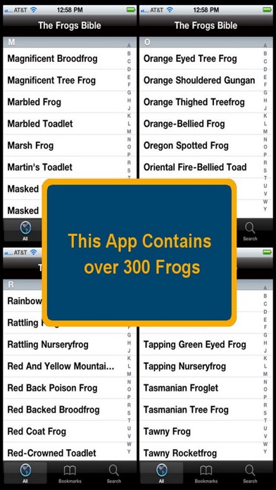 *********************** 50% Promotional Sales! Limited Time Only! *********************** The Frogs Bible is an application containing detailed information of over 300 species of frogs & toads commonly found in the wild. It is probably the most complete and comprehensive frog encyclopedia available in the App Store. This App is an excellent app for people who love frogs as pets or for those who are interested in knowing more about these exotic creatures. For each type of frogs, the following information is included for easier reference: * High Quality Photo * Scientific Name * Common Name * Family, Genus, Species * Size * Appearance * Voice Description * Behavior * Diet * Reproduction Info * Demographics * Habitat * Toxonomic Notes * Conservative Issues * Other Detailed Descriptions The application is optimized for iPad/iPad2/The New iPad/iPad mini, iPhone 3GS/4/4S/5/5S/5C/6/6+/6S/6S+/7/7+ & iPod Touch. *********************** FEATURES This application has the following features: * User friendly interface to preview all species in one view * Ability to BOOKMARK selected items for easier reference * Add a CUSTOM NOTE to any item * iCloud synchronized Bookmarks and Custom Notes * EMAIL any items to yourself & friends * A item SEARCH engine * Enter a RANDOM entry when shaking the device (if you cannot make up your mind) * OFFLINE browsing *********************** This application is brought to you by Fobotech LLC.