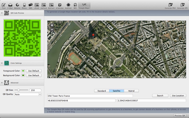 *** NOTE TO SNOW LEOPARD USERS *** iSight Scanning is a Lion Only feature. You can still scan QR codes in Snow Leopard but you will have to use images that you can drag into QR Codes to scan. Create and Scan QR codes for any need quickly and easily with QR Encode. QR Encode is a QR code generator that makes creating QR codes a snap. Select the QR code you wish to create, fill in the information and click on preview. QR Encode is now also a QR code scanner that uses your Macs built-in iSight camera for scanning. You can also use images of QR codes and drag them into QR Encode. QR Encode comes feature packed. You can generate the following QR codes: - Free Form Text - E-Mail Address - Website URL - Phone Number - SMS Message - vCard - meCard - bizCard - vCalendar - Android Market Links - WiFi for Android - Google Maps Location QR Encode will recognize the following QR codes for scanning: - E-Mail Address - E-Mail Message - Website URL's - Phone Numbers - SMS Messages - VCard - meCard - bizCard - vCalendar - Google Maps QR Code Scanning offers an import option for each of the QR types listed above to import the information into QR Encode E-Mail Addresses and Messages have an additional option of being opened with your default e-mail client and will auto populate the To, Subject and Body fields if available. Website URL's have an additional option for opening the URL in your default browser. VCard, meCard and bizCard have an additional option of being added to the Address Book. VCalendar has an additional option of having the containing event added to your Calendar Google Maps has an additional option of opening your default browser to the location within the QR code. QR Encode supports exporting your are code in PNG format. QR Encode also supports full screen mode in Lion. QR Encode uses an embedded Google Map to help you easily and interactively search for locations to encode within your QR code. Additional features also allow you to change the foreground and the background color of the QR code as well as setting the size and the quality of the QR code.