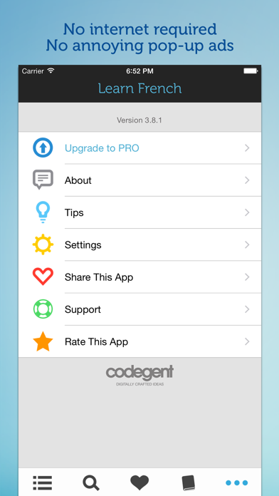 We have reduced the price for this holiday seasons. So you can enjoy learning French for less! Learn French is an easy to use mobile French phrasebook that will give visitors to France and those who are interested in learning French a good start in the language. Learn French is recorded using a native speaker and we have tried our best to be authentic in the pronunciation whilst ensuring it is easy to understand. Recommended app for tourists and business people visiting France. FEATURES: • Universal app works on iPhone, iPod Touch, & iPad • Carefully translated list of essential phrases • 200+ common words and phrases included for FREE • Upgrade and unlock all 1,900+ phrases in 22 categories • Audio recorded by native speakers • Option to playback audio at slower speed • No internet connection required • Highlight important words with tips • Store frequently used phrases in favourites • Search by words inside the app • No adverts or annoying popups HAPPY CUSTOMERS "Simply put, this app is well organized, clear and concise. I really enjoy it." -Kelvin Green "It's easy and works every time, the words are clear and the pronunciation is accurate. I love it!" - Yuyu1 "Very useful and includes a lot of necessary phrases for free :)" - FettiHeadGore CATEGORIES FREE Categories: * Greetings * General conversation * Numbers * Time and date * Directions and places * Transportation * Emergency PRO Categories: * Accommodation * Eating out * Shopping * Colours * Towns and provinces * Countries * Tourist attractions * Family * Dating * Feeling sick * Body parts * Occasion phrases * Sports * Action words * Tongue twisters • HOW TO RESTORE PURCHASES? Purchases are one-time and carry over between devices. To restore your purchases on a new device, tap on PRO badge on one of the locked categories, tap on the Restore Purchase button. Even if you forget to do this step and try to buy the app again, it will be restored for free. • WE READ EVERY E-MAIL. We're a small company, but we reply to every support request. Let us try to help at [email protected] and we will do our best to help in any way! THANKS FOR ALL THE SUPPORT IF YOU LIKE THE APP PLEASE LEAVE A REVIEW :-)